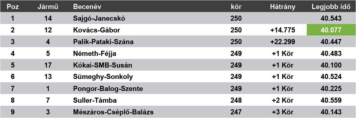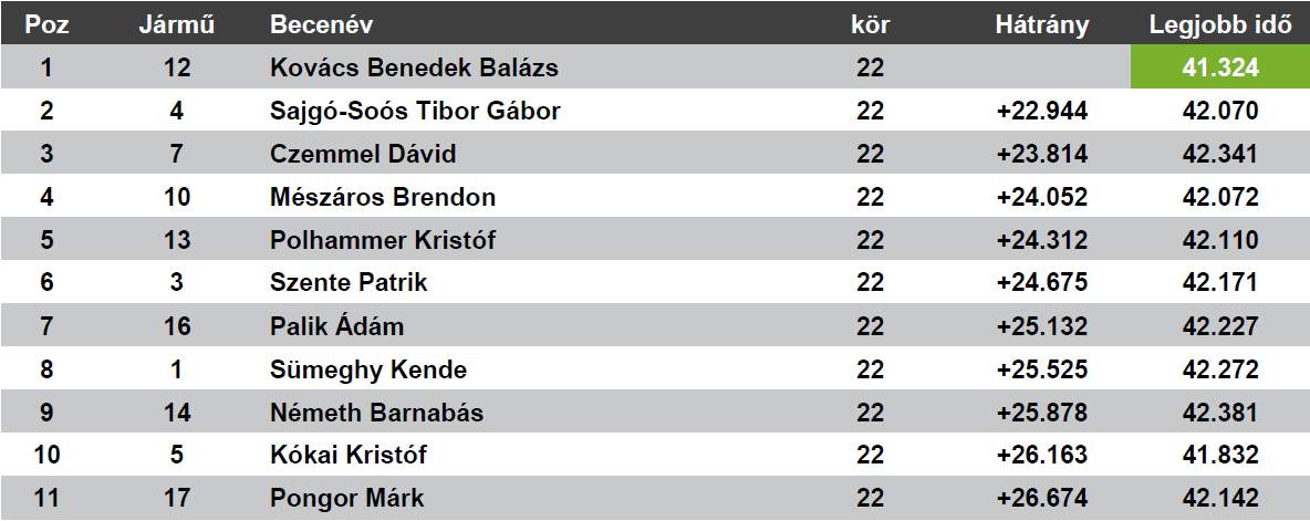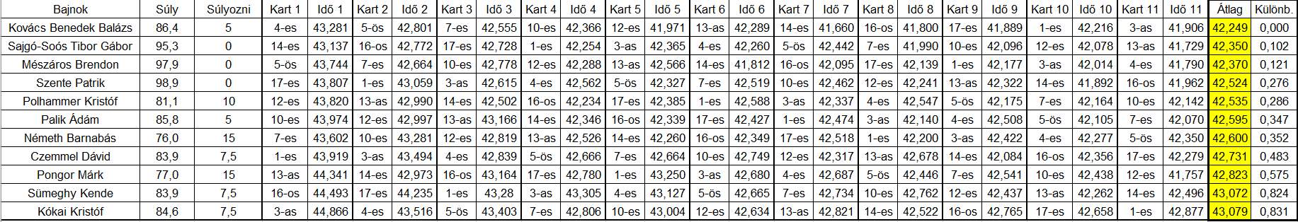 Végeredmény (22 kör, normál irány, 90 kg-ra súlyozva)